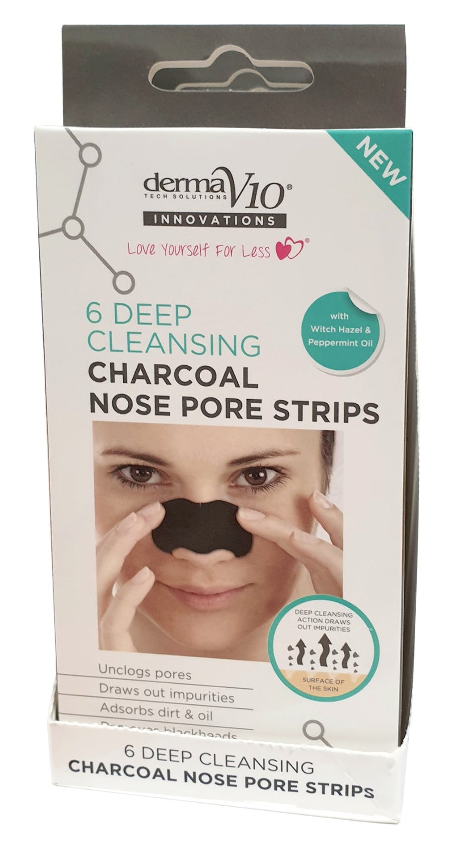 DermaV10 Deep Cleansing Charcoal Nose Strips er en pakke med 6 næsestrips, der ved brug af aktivt kul hjælper med at rense din næse fri for blokerede porer og sorte hudorme. De effektive og populære DermaV10 næsetrips fungerer som en magnet, der trækker h
